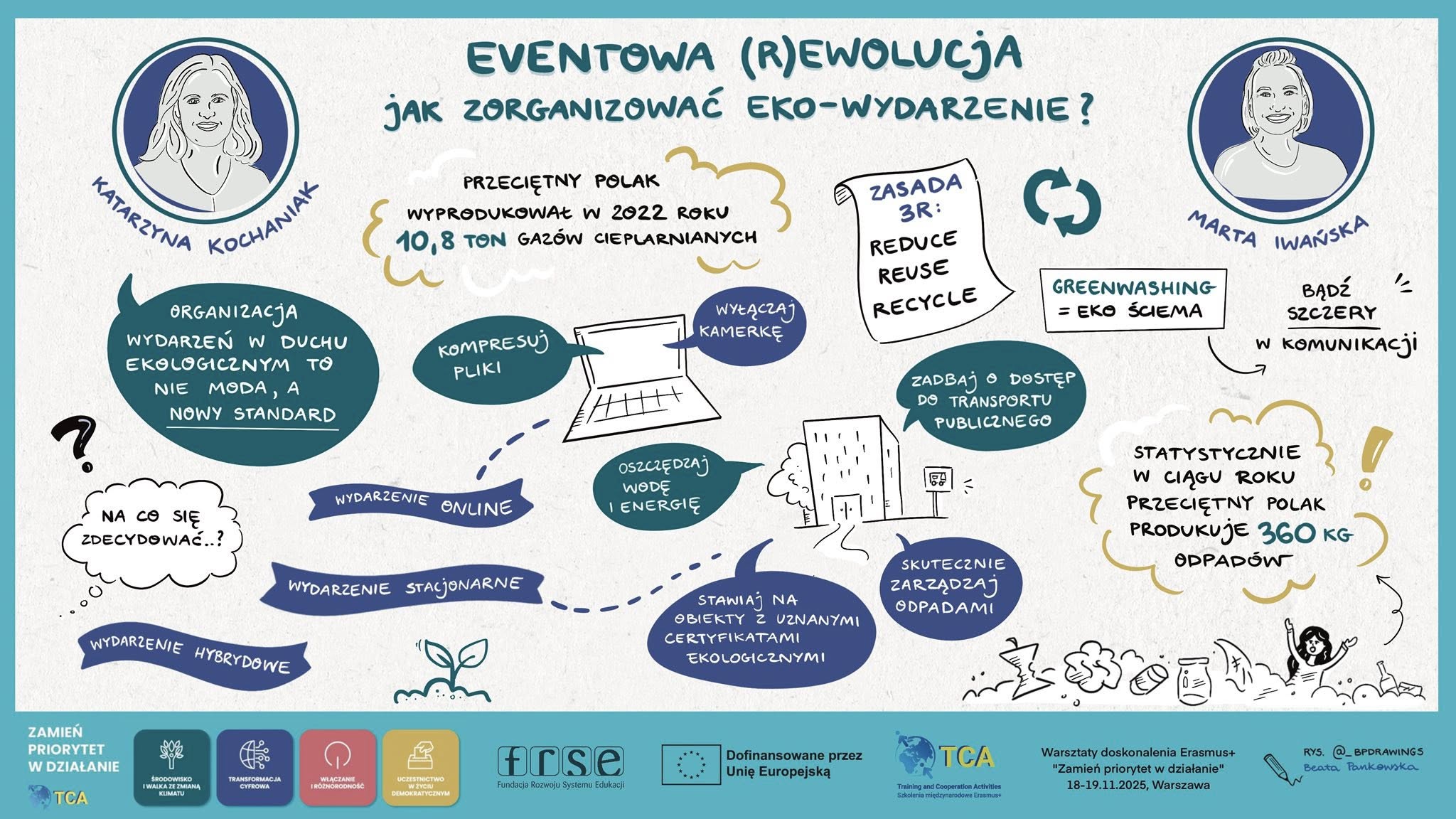 Konferencja rozpoczęła się od spotkania wszystkich uczestniczek i uczestników na głównej sali i wystąpienia Jarosława Chybickiego („Od chaosu do spójności – jak uważność pomaga integrować priorytety i zapobiegać wypaleniu”). Kolejny wykład („Eventowa (r)ewolucja – jak zorganizować eko-wydarzenie?”) poprowadziły Katarzyna Kochaniak i Marta Iwańska. Podczas obu tych wystąpień miałam przyjemność tworzyć na żywo zapis graficzny, który w czasie rzeczywistym był wyświetlany na bocznym ekranie obok sceny głównej. Dzięki temu osoby uczestniczące w wydarzeniu mogły na bieżąco podglądać powstające notatki, a w przerwach podchodzić do ekranu i nawiązywać rozmowy dotyczące poszczególnych treści wystąpień. Przyglądanie się osobom, które robią zdjęcia notatek i rozmawiają o ich elementach to dla mnie jeden z najbardziej satysfakcjonujących momentów podczas wydarzeń na żywo 🙂
